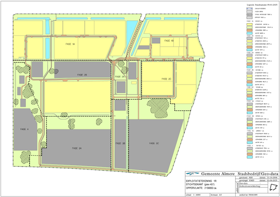 Binnen het totale plangebied van 216 ha. is 131 ha. Uitgeefbaar (61%) en 85 ha. (39%) openbaar gebied. Van het totaal van 131 ha. is 61 ha. (grijs gearceerd) nog uit te geven (47 %) en is 70 ha. (geel) uitgegeven (53%).