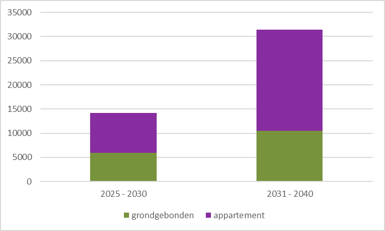 De stad ontwikkelt zich echter ook verder voor meer diverse doelgroepen en woonbehoeften. De gebieden waar de komende jaren de meeste woningbouw is voorzien, krijgen een meer stedelijk karakter. Dat weerspiegelt zich in een toename van het aantal appartementen in de plancapaciteit. Deze aanduiding zegt nog niks over de omvang en hoogte van de uiteindelijke complexen waar deze woningen ontwikkeld zullen worden. Ook kunnen er in de uiteindelijke programmering nog keuzes gemaakt worden over de grootte van appartementen, zodat ze ook voor gezinnen aantrekkelijk zijn. Niettemin zal in 2040 een groter deel van de Almeerse bewoners niet meer in het traditionele rijtjeshuis met tuin wonen.